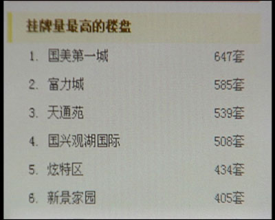 从搜房网的数据显示,在挂牌量最高的十家楼盘中,最高的国美第一城达到647套,富力城排第二585套,在这十家最活跃的楼盘中,有七家楼盘的价格出现了下跌,下跌的时间大约都在2007年年底。
