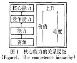 图1的左边自底到顶依次是,企业的资源 (Resource)、能力(Capability)、竞争能力 (Competence)和核心能力(Core competence)。图1的右边表明:从企业的资源到企业的核心能力,其价值水平不断提升,与此同时,其难度也在逐步加大。