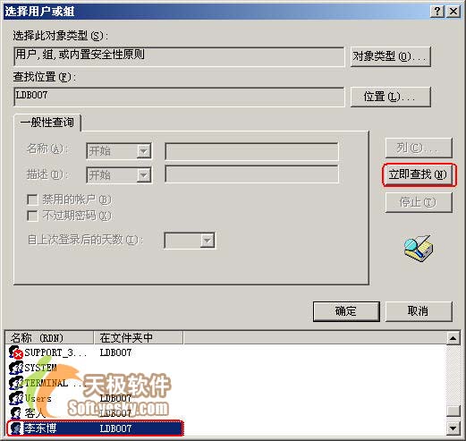 然后在“选择用户或组”对话框中单击“高级”按钮,再单击“立即查找”按钮,这时就会在下方列出本机中的用户或组。选择要给予权限的用户。