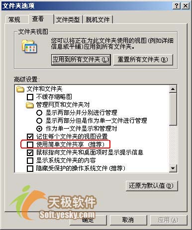 1、以具有管理员权限的用户登录XP,在XP中打开资源管理器,选择菜单“工具|文件夹选项”,打开“文件夹选项”对话框。在对话框中单击“查看”选项卡,取消复选框“使用简单共享”。