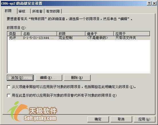 3、单击图2所示对话框中的“高级”按钮,弹出“i386-sp2的高级安全设置”对话框,显示目前该项目的所有者为刚才看到的未知帐户。选择“将所有者更改为”下方的用户,比如笔者现在使用的用户名称,然后单击“应用”按钮,所有者就改变为现在用户了,如图3所示。