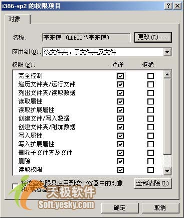 5、连续单击两次“确定”按钮,直到出现“i386-sp2的权限项目”对话框。在“权限”中的“完全控制”右侧选择“允许”复选框,则就会取得对该文件夹所有的控制权。单击“确定”按钮。