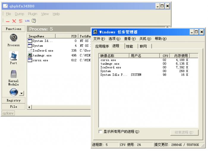 接下来,可以杀死Explorer.exe、svchost.exe、Services.exe等系统进程和所有的用户进程,但是System Idle Process、SYSTEM、CSRSS.exe和冰刃自身这几个进程个不要动,其他的,可以统统结束掉,接下来,就可以删除病毒的所有文件和驱动了,全都解决以后,用冰刃结束CSRSS.exe,强制重启系统就可以了。