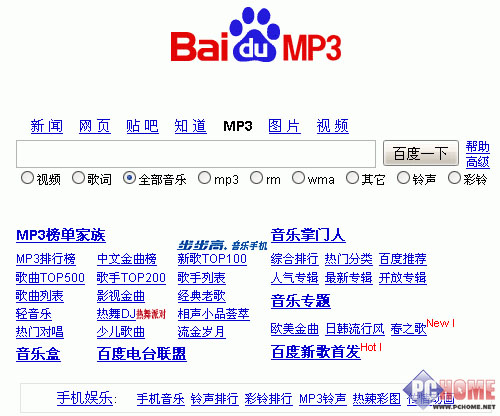 这是一个我们再熟悉不过的界面了,可能你曾经无数的打开这个页面也并没有好好地去看一看他,一步步走来百度MP3已经有了一个极为庞大的以音乐搜索服务为基础的整套服务内容系统,虽然有着长年累月的被唱片公司控诉的盗版问题,但我们任何一个经常使用互联网的国人都无法忽视百度MP3的存在。