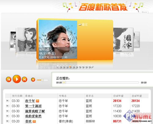 百度MP3的“新歌首发”栏目服务直接呈现给使用者的就是一个音乐播放界面和播放列表,让你可以快速的了解最近发布的一些新歌并在热门的歌曲上标注记号,让使用者可以快速筛选查阅试听。