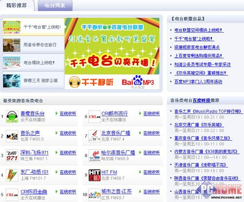 不仅如此,百度MP3更是联合的全国许多电台组成了“百度电台联盟”。2008年的3月以来,“百度电台联盟”已经成为相当多的长日在电脑前工作的人士收听电台的第一选择,超广泛的电台选择和详细的节目列表,让你可以将想听的电台一网打尽,最近“百度电台联盟”更是联合著名的国产免费音乐软件“千千静听”共同推出了“音乐窗电台”。只要使用千千静听就能很方便的收听百度提供的电台节目,对喜欢收听电台的人来说,确实是不小的福音。