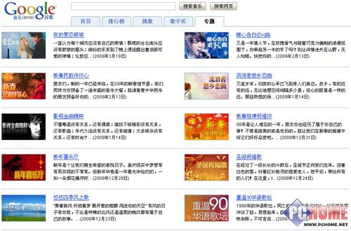 专题是谷歌音乐的另一个比较大的服务项目,其功能类似于度MP3的“音乐掌门人”,同样是利用一个专题将站内的歌曲资源做一个临时的整合,但和百度MP3的“音乐掌门人”不同的是,谷歌音乐的专题应该是由谷歌方面的人员制作的,单就亲和力和交互性而言尚无法和“音乐掌门人”相提并论,开放、交互式的设计会帮助谷歌音乐快速的成长,也希望谷歌音乐能够看到这一点,并非是要借鉴,也可以开发出属于自己的“音乐掌门人”类音乐搜索服务。