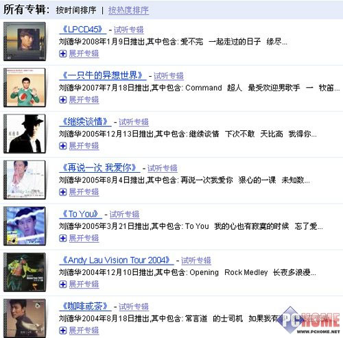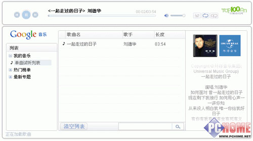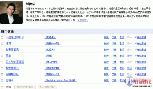 如果说百度MP3的产品服务是“全”,也就是广义上的产品种类多的话,那么谷歌音乐就是真正音乐上的“全”。最简单直观的例子就是关于歌手的。假如我们在歌手列表中找到并打开“刘德华”,我们首先可以看到的是由“歌手个人介绍”、“歌手热门歌曲”、“歌手专辑”三大板块内容组成的页面。可以说对初次使用的人来说,多少会有些吃惊。确实,谷歌音乐所展示给我们的就是一个超全并且十分完整的音乐曲库,只要你能在曲库中找到该歌手的名字,就能相应的找到所有关于该歌手从出道至今的所有歌曲,想必这也就是获得正版授权的最大好处了吧。