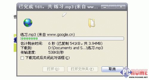 再来看下载速度,我们可以看到在下载对话框中很明白了显示了(来自www.google.cn)的字样,速度也相当的快,对一般的使用者来说,似乎目前不会在找到比谷歌音乐更好更方便的音乐下载站点了,除非你在歌手列表中找不到你想要的歌曲。