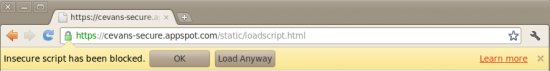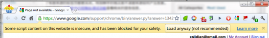 自 Chromium 14 的首个版本 (14.0.785.0 canary) 起,Google 将开始测试默认拦截混合脚本。当拦截到混合脚本时会出现这样的信息栏: