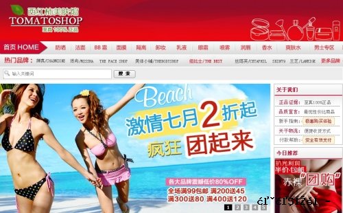 1)主色调:店铺首页的主色调为大红色,整体效果有点跟小也香水类似。使用醒目色红色来引起注意,聚集视觉焦点,这本身无可厚非。但考虑到当前是炎 炎夏目,暖色系大红大黄容易让用户产生烦燥情绪,造成跳失率偏高的情况。相比之下芳草集的绿色调,御泥坊的灰蓝色调,相宜本草的蓝绿色调都更胜一筹,让用 户看起来清新舒爽。其实类似这个店铺首屏这张焦点图的效果就非常友好。因此建议在做店铺整体风格设计的时候考试到季节因素气候因素。