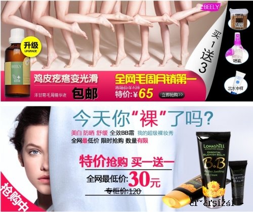 3)框架布局。在框架布局方面,应该更多的考虑到用户的浏览习惯。根据Google的眼动仪测试报告。用户在浏览网页的时候,习惯路径是从上到下, 从左到右。综合起来,就是“F”型的热点区域。因此店铺首页在做布局设计的时候,也要考虑到这些方面。西红柿美肤馆这个店铺显然没有考虑到这一点,三屏以 下,基本上采用的都是相类似模块的重复堆砌,例如下图,两张图如此近的堆砌,究竟是让用户看哪一张呢