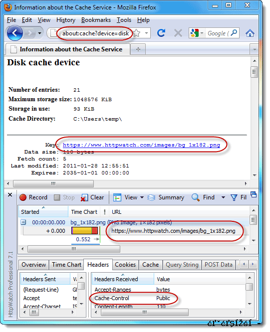 Firefox默认只在内存中缓存HTTPS。但是,只要头命令中有Cache-Control: Public,缓存就会被写到硬盘上。下面的图片显示,Firefox的硬盘缓存中有HTTPS内容,头命令正是Cache-Control:Public。