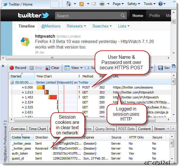 也就是说,这些cookie是在HTTPS环境下建立的,但是却在HTTP环境下传输。如果有人劫持到这些cookie,那他就能以你的身份在Twitter上发言了。