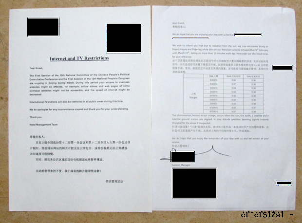 My wife and I have spent the past several nights at a hotel in Beijing, and we’ve just arrived at one in Shanghai. Both of the hotels are very nice and welcoming, and on check-in each of them provided a special notice about communication problems guests might encounter during their stay. Here are the notices side-by-side. You probably can’t read the tiny print, but there is an explanation below.