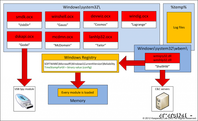 Gauss的多个模块都以知名近代数学家名字命名(如卡巴斯基实验室公布的这张图所示),像高斯、哥德尔和拉格朗日。为了破解其加密负载的密钥,密码破译专家尝试了数百万次,都无功而返。加密负载位于哥德尔模块中,当有U盘和可移除驱动器插入被感染的机器上后,加密负载将会悄悄载入。当U盘和可移除驱动器插到另一台未感染的机器上后,神秘代码开始执行——但它只在Gauss开发者针对的特定机器上执行。而在其它非目标计算机上,它会被严密包裹起来,防止被进行研究或逆向工程。加密负载显然是为了防止外界知道受害者身份或恶意程序的意图。Gauss开发者没有使用先进的加密技术,而是已过时的 RC4 和MD5弱加密算法,可能是因为它们使用最广泛。解锁哥德尔秘密负荷的密钥是基于特定计算机设置动态产生。为阻止破解代码,Gauss MD5哈希目标设置数据1万次,然后输出最终结果解锁加密代码。