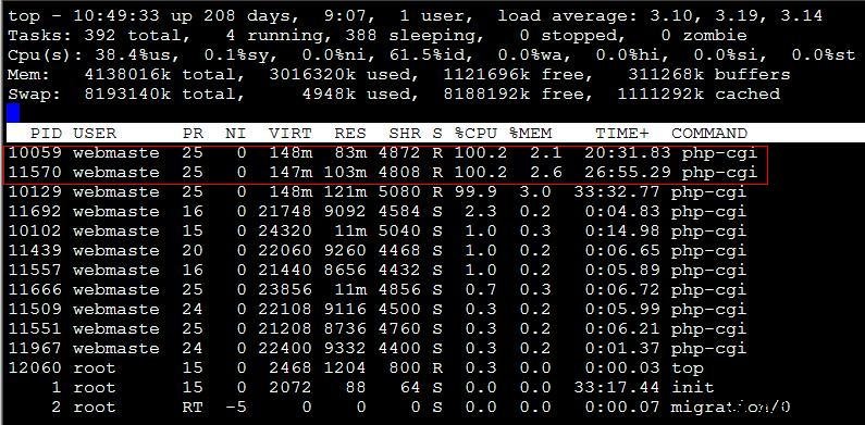 1. 得到占用cpu资源过多的php-cgi进程的pid(进程id), 使用top命令即可,如下图: