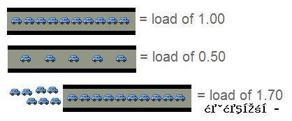 Most people have an inkling of what the load averages mean: the three numbers represent averages over progressively longer periods of time (on First, a little background on what the load average values mean. We’ll start out with the simplest case: a machine with on The traffic analogy A single-core CPU is like a single lane of traffic. Imagine you are a bridge operator … sometimes your bridge is so busy there are cars lined up to cross. You want to let folks know how traffic is moving on your bridge. A decent metric would behow many cars are waitingat a particular time. If no cars are waiting, incoming drivers know they can drive across right away. If cars are backed up, drivers know they’re in for delays. So, Bridge Operator, what numbering system are you going to use? How about: 0.00 means there’s no traffic on the bridge at all. In fact, between 0.00 and 1.00 means there’s no backup, and an arriving car will just go right on.1.00 means the bridge isexactlyat capacity.All is still good, but if traffic gets a little heavier, things are going to slow down.over 1.00 means there’s backup.How much? Well, 2.00 means that there are two lanes worth of cars total — on