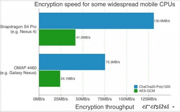 Bursztein解释称,ChaCha20-Poly1305的融合算法能够在采用骁龙S4 Pro芯片的智能手机上以139.9MBPs(兆字节每秒)的速度发出加密数据,比如谷歌的Nexus 4手机上所用的就是S4 Pro芯片;与之相较,AES-GCM算法加密数据的速率仅为41.5MBps。