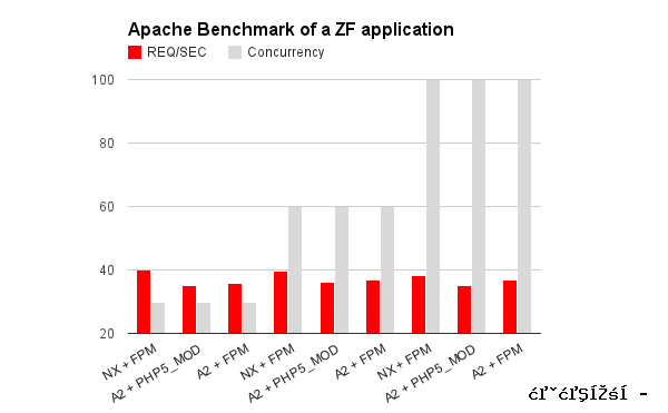 First set of benchmarks was performed against the large ZF application. Each test consisted of 1000 requests and different level of concurrency (30/60/100). I tested 3 different setups: Apache2 with PHP5_MOD, Apache2 with PHP-FPM and NGINX with PHP-FRM.