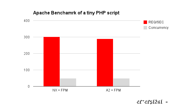 The second test was against a tiny PHP script. The script was printing “Lorem Ipsum” 50 times. I benchmarked it with 1000 requests and concurrency set to 50.