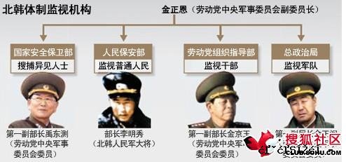 有分析称,金正恩时代的北韩除了有金敬姬和张成泽夫妇外,还有掌控监视机构的“掌权四人帮”。他们分别是国家安全保卫部第一副部长禹东测、人民保安部部长李明秀、劳动党组织指导部第一副部长金京玉和总政治局第一副局长金正阁。其中禹东测、金京玉、金正阁三人是成为金正恩时代最高权力机构的中央军事委员会成员。北韩人民军现役大将李明秀今后也很有可能进入中央军事委员会。一位消息人士表示:“金正恩通过这四个人率先掌控了体制监视机构。”