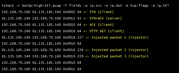 在GitHub遭受的大规模DDoS攻击中,攻击者创造性的劫持了百度的JS数据包,让大约1%访问嵌入百度JS的海外中国网站访问者成为DDoS大军中的一员。攻击者是如何做到的,如何确定这与百度无关?网络中传输的数据包是有寿命的,为了防止数据无限循环,名为存活时间(Time to live,TTL)或跳数限制(hop limit)的机制限定了数据包的寿命。一旦寿命结束,数据包将会被丢弃。在这次攻击中,恶意数据包和合法分析代码的TTL值是不同的。如图所示,合法SYN+ACK 数据包的TTL是42跳,攻击者注入的三个恶意数据包的TTL分别是227、228和229跳。SYN+ACK数据包源自百度服务器,而注入的数据包则来自其它地方。在外界注意到TTL值的差异后,攻击者显然改变了策略,在最新劫持新浪JS文件的攻击中,TTL的值没有发生变化。此次劫持发生在今天。GitHub的服务已经完全恢复了正常。